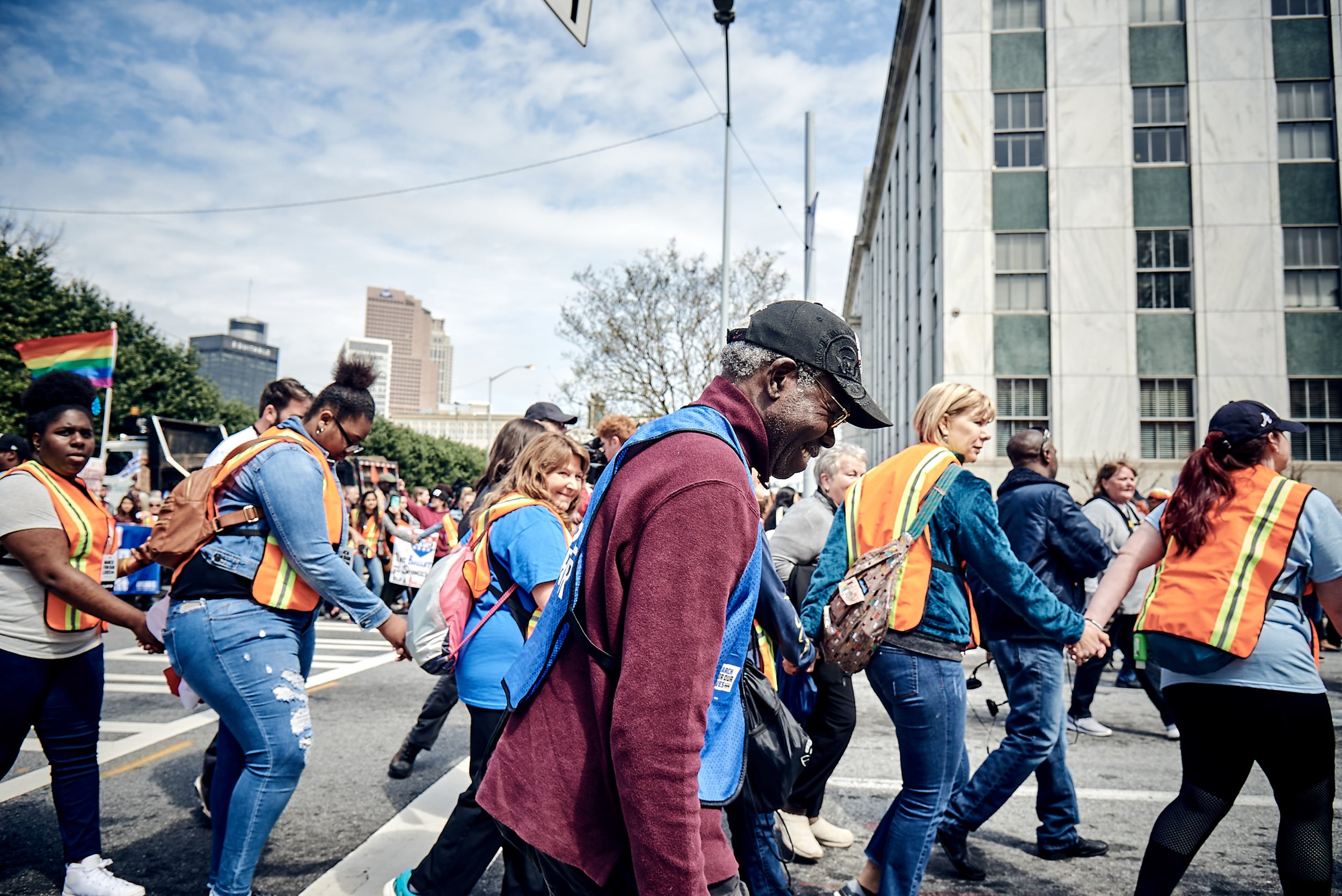 Group of diverse people holding hands and participating in a march or protest, with some wearing orange safety vests, street scene with buildings and cloudy sky in the background. View fullsize